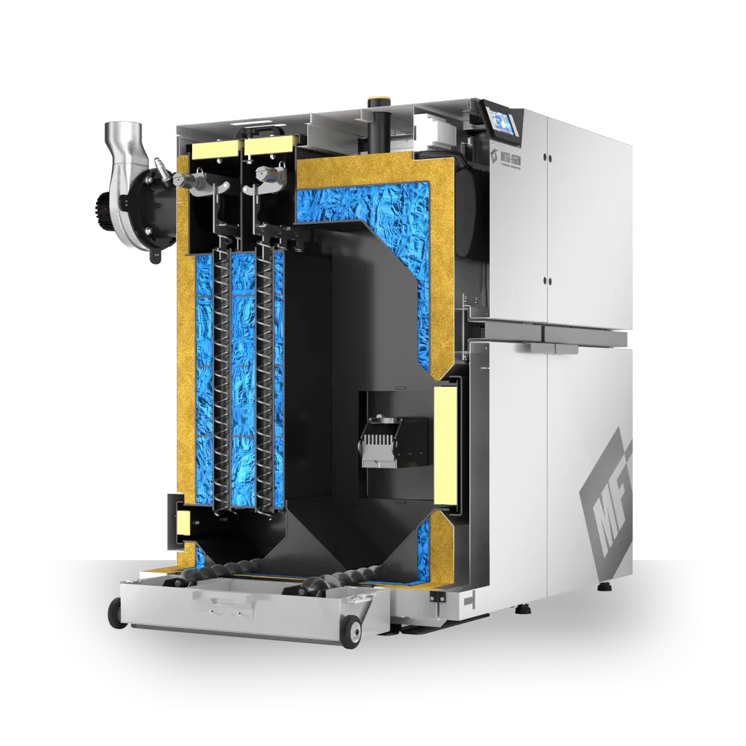 The automatic ash removal system automatically removes ash to an external container, extends service intervals and keeps the combustion chamber clean. Thanks to this, the boiler works more efficiently and the user spends less time on maintenance.