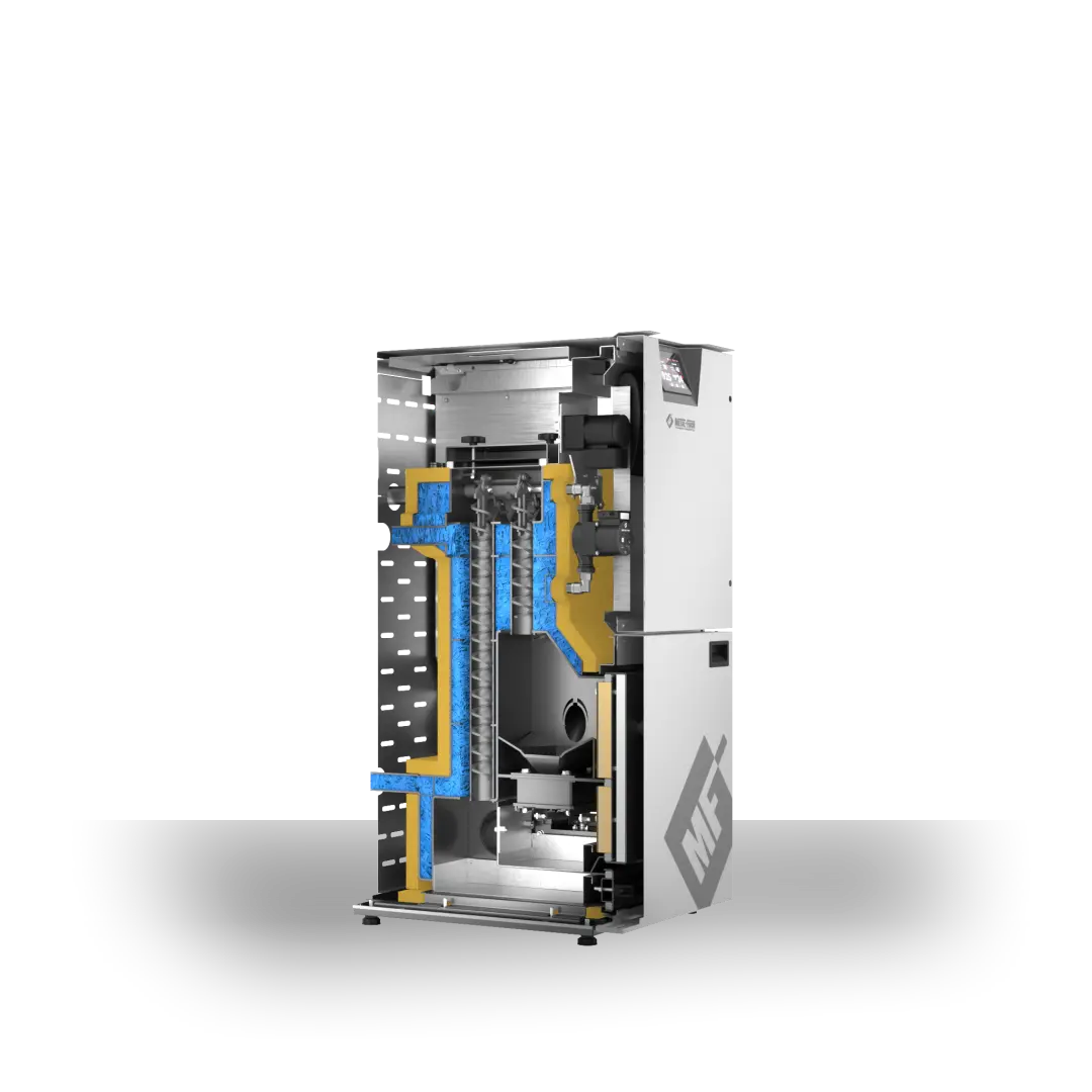 - Minimalizuje obsługę - automatyczne czyszczenie kanałów konwekcyjnych zapobiega gromadzeniu się popiołu, co utrzymuje wysoką sprawność urządzenia i ogranicza potrzebę ręcznej konserwacji.